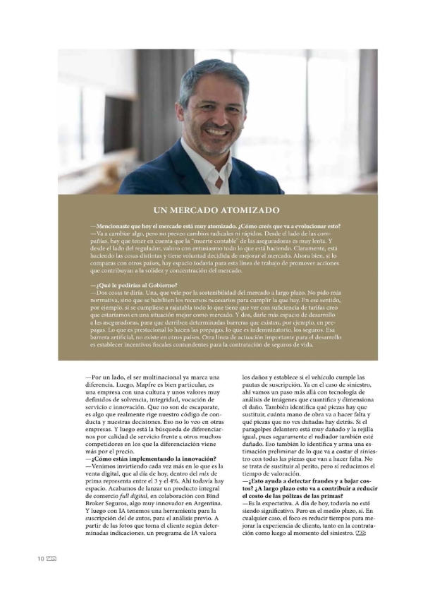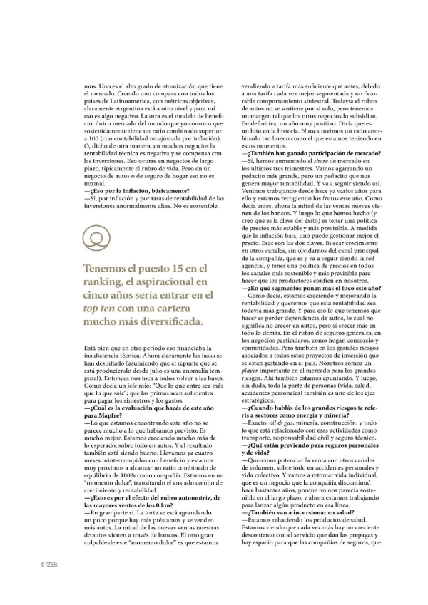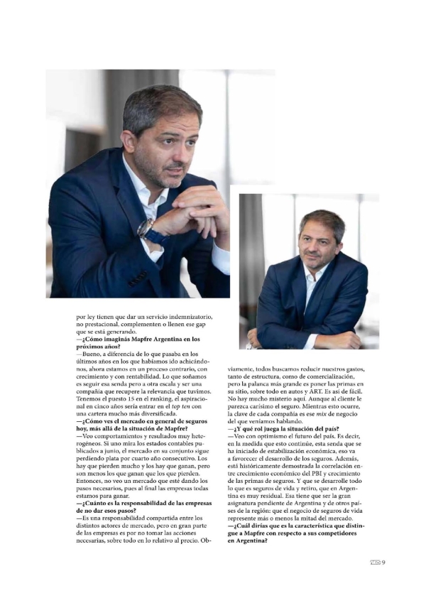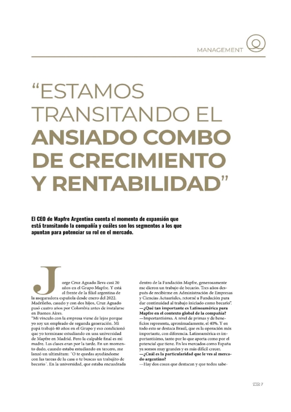 Jorge Cruz Aguado lleva casi 20 años en el Grupo Mapfre. Y está al frente de la filial argentina de la aseguradora española desde enero del 2022. Madrileño, casado y con dos hijos, Cruz Aguado pasó cuatro años por Colombia antes de instalarse en Buenos Aires. "Mi vínculo con la empresa viene de lejos porque yo soy un empleado de segunda generación. Mi papá trabajó 40 años en el Grupo y eso condicionó que yo terminase estudiando en una universidad de Mapfre en Madrid. Pero la culpable final es mi madre. Las clases eran por la tarde. En un momento dado, cuando estaba estudiando en tercero, me lanzó un ultimátum: 'O te quedas ayudándome con las tareas de la casa o te buscas un trabajito de becarioEn la universidad, que estaba encuadrada dentro de la Fundación Mapfre, generosamente me dieron un trabajo de becario. Tres años después de recibirme en Administración de Empresas y Ciencias Actuariales, retorné a Fundación para dar continuidad al trabajo iniciado como becario". -¿Qué tan importante es Latinoamérica para Mapfre en el contexto global de la compañía? -Importantísimo. A nivel de primas y de beneficios representa, aproximadamente, el 40%. Y en todo esto se destaca Brasil, que es la operación más importante, con diferencia. Latinoamérica es importantísimo, tanto por lo que aporta como por el potencial que tiene. En los mercados como España ya somos muy grandes y es más difícil crecer. -¿Cuál es la particularidad que le ves al mercado argentino? -Hay dos cosas que destacan y que todos sabe mos. Uno es el alto grado de atomización que tiene el mercado. Cuando uno compara con todos los países de Latinoamérica, con métricas objetivas, claramente Argentina está a otro nivel y para mí eso es algo negativo. La otra es el modelo de beneficio, único mercado del mundo que yo conozco que sostenidamente tiene un ratio combinado superior a 100 (con contabilidad no ajustada por inflación). O, dicho de otra manera, en muchos negocios la rentabilidad técnica es negativa y se compensa con las inversiones. Eso ocurre en negocios de largo plazo, típicamente el rubro de vida. Pero en un negocio de autos o de seguro de hogar eso no es normal. -¿Eso por la inflación, básicamente? -Sí, por inflación y por tasas de rentabilidad de las inversiones anormalmente altas. No es sostenible. Está bien que en otro período eso financiaba la insuficiencia técnica. Ahora claramente las tasas se han desinflado (asumiendo que el repunte que se está produciendo desde julio es una anomalía temporal). Entonces nos toca a todos volver a las bases. Como decía un jefe mío: "Que lo que entre sea más que lo que sale"; que las primas sean suficientes para pagar los siniestros y los gastos. -¿Cuál es la evaluación que hacés de este año para Mapfre? -Lo que estamos encontrando este año no se parece mucho a lo que habíamos previsto. Es mucho mejor. Estamos creciendo mucho más de lo esperado, sobre todo en autos. Y el resultado también está siendo bueno. Llevamos ya cuatro meses ininterrumpidos con beneficio y estamos muy próximos a alcanzar un ratio combinado de equilibrio de 100% como compañía. Estamos en un "momento dulce", transitando el ansiado combo de crecimiento y rentabilidad. -¿Esto es por el efecto del rubro automotriz, de las mayores ventas de los 0 km? -En gran parte sí. La torta se está agrandando un poco porque hay más préstamos y se venden más autos. La mitad de las nuevas ventas nuestras de autos vienen a través de bancos. El otro gran culpable de este "momento dulce" es que estamos vendiendo a tarifa más suficiente que antes, debido a una tarifa cada vez mejor segmentada y un favorable comportamiento siniestral. Todavía el rubro de autos no se sostiene por sí solo, pero tenemos un margen tal que los otros negocios lo subsidian. En definitiva, un año muy positivo. Diría que es un hito en la historia. Nunca tuvimos un ratio combinado tan bueno como el que estamos teniendo en estos momentos. -¿También han ganado participación de mercado? -Sí, hemos aumentado el share de mercado en los últimos tres trimestres. Vamos agarrando un pedacito más grande, pero un pedacito que nos genera mayor rentabilidad. Y va a seguir siendo así. Venimos trabajando desde hace ya varios años para ello y estamos recogiendo los frutos este año. Como decía antes, ahora la mitad de las ventas nuevas vienen de los bancos. Y luego lo que hemos hecho (y creo que es la clave del éxito) es tener una política de precios más estable y más previsible. A medida que la inflación baja, uno puede gestionar mejor el precio. Esas son las dos claves. Buscar crecimiento en otros canales, sin olvidarnos del canal principal de la compañía, que es y va a seguir siendo la red agencial, y tener una política de precios en todos los canales más sostenible y más previsible para hacer que los productores confíen en nosotros. -¿En qué segmentos ponen más el foco este año? -Como decía, estamos creciendo y mejorando la rentabilidad y queremos que esta rentabilidad sea todavía más grande. Y para eso lo que tenemos que hacer es perder dependencia de autos, lo cual no significa no crecer en autos, pero sí crecer más en todo lo demás. En el rubro de seguros generales, en los negocios particulares, como hogar, consorcio y comunidades. Pero también en los grandes riesgos asociados a todos estos proyectos de inversión que se están gestando en el país. Nosotros somos un player importante en el mercado para los grandes riesgos. Ahí también estamos apuntando. Y luego, sin duda, toda la parte de personas (vida, salud, accidentes personales) también es uno de los ejes estratégicos. -¿Cuando hablás de los grandes riesgos te referís a sectores como energía y minería? -Exacto, oil & gas, minería, construcción, y todo lo que está relacionado con esas actividades como transporte, responsabilidad civil y seguro técnico. -¿Qué están previendo para seguros person