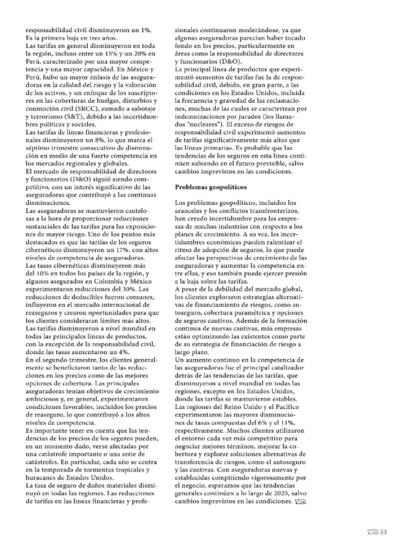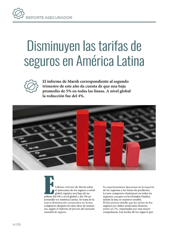 E1 último informe de Marsh sobre I m el panorama de los seguros a nivel global registra una baja de las pólizas del 4% a nivel global y del 5% en promedio en América Latina. Se trata de la cuarta disminución consecutiva en la tasa compuesta después de siete años de aumentos, según el Informe de precios del mercado mundial de seguros. Se experimentaron descensos en la mayoría de las regiones y las líneas de productos. La tasa compuesta disminuyó en todas las regiones, excepto en los Estados Unidos, donde la tasa se mantuvo estable. El documento detalla que las tarifas de los seguros por daños materiales disminuyeron un 7%, impulsadas por una mayor competencia. Las tarifas de los seguros por responsabilidad civil disminuyeron un 1%. Es la primera baja en tres años. Las tarifas en general disminuyeron en toda la región, incluso entre un 15% y un 20% en Perú, caracterizado por una mayor competencia y una mayor capacidad. En México y Perú, hubo un mayor énfasis de las aseguradoras en la calidad del riesgo y la valoración de los activos, y un enfoque de los suscripto- res en las coberturas de huelgas, disturbios y conmoción civil (SRCC), sumado a sabotaje y terrorismo (S&T), debido a las incertidumbres políticas y sociales. Las tarifas de líneas financieras y profesionales disminuyeron un 8%, lo que marca el séptimo trimestre consecutivo de disminución en medio de una fuerte competencia en los mercados regionales y globales. El mercado de responsabilidad de directores y funcionarios (D&O) siguió siendo competitivo, con un interés significativo de las aseguradoras que contribuyó a las continuas disminuciones. Las aseguradoras se mantuvieron cautelosas a la hora de proporcionar reducciones sustanciales de las tarifas para las exposiciones de mayor riesgo. Uno de los puntos más destacados es que las tarifas de los seguros cibernéticos disminuyeron un 17%, con altos niveles de competencia de aseguradoras. Las tasas cibernéticas disminuyeron más del 10% en todos los países de la región, y algunos asegurados en Colombia y México experimentaron reducciones del 30%. Las reducciones de deducibles fueron comunes, influyeron en el mercado internacional de reaseguros y crearon oportunidades para que los clientes consideraran límites más altos. Las tarifas disminuyeron a nivel mundial en todas las principales líneas de productos, con la excepción de la responsabilidad civil, donde las tasas aumentaron un 4%. En el segundo trimestre, los clientes generalmente se beneficiaron tanto de las reducciones en los precios como de las mejores opciones de cobertura. Las principales aseguradoras tenían objetivos de crecimiento ambiciosos y, en general, experimentaron condiciones favorables, incluidos los precios de reaseguro, lo que contribuyó a los altos niveles de competencia. Es importante tener en cuenta que las tendencias de los precios de los seguros pueden, en un momento dado, verse afectadas por una catástrofe importante o una serie de catástrofes. En particular, cada año se centra en la temporada de tormentas tropicales y huracanes de Estados Unidos. La tasa de seguro de daños materiales disminuyó en todas las regiones. Las reducciones de tarifas en las líneas financieras y profesionales continuaron moderándose, ya que algunas aseguradoras parecían haber tocado fondo en los precios, particularmente en áreas como la responsabilidad de directores y funcionarios (D&O). La principal línea de productos que experimentó aumentos de tarifas fue la de responsabilidad civil, debido, en gran parte, a las condiciones en los Estados Unidos, incluida la frecuencia y gravedad de las reclamaciones, muchas de las cuales se caracterizan por indemnizaciones por jurados (los llamados "nucleares"). El exceso de riesgos de responsabilidad civil experimentó aumentos de tarifas significativamente más altos que las líneas primarias. Es probable que las tendencias de los seguros en esta línea continúen subiendo en el futuro previsible, salvo cambios imprevistos en las condiciones. Problemas geopolíticos Los problemas geopolíticos, incluidos los aranceles y los conflictos transfronterizos, han creado incertidumbre para las empresas de muchas industrias con respecto a los planes de crecimiento. A su vez, las incertidumbres económicas pueden ralentizar el ritmo de adopción de seguros, lo que puede afectar las perspectivas de crecimiento de las aseguradoras y aumentar la competencia entre ellas, y eso también puede ejercer presión a la baja sobre las tarifas. A pesar de la debilidad del mercado global, los clientes exploraron estrategias alternativas de financiamiento de riesgos, como au- toseguro, cobertura paramétrica y opciones de seguros cautivos. Además de la formación continua de nuevas cautivas, más empresas están optimizando las existentes como parte de su estrategia de financiación de riesgo a largo plazo. Un aumento continuo en la competencia de las aseguradoras fue el principal catalizador detrás de las tendencias de las tarifas, que disminuyeron a nivel mundial en todas las regiones, excepto en los Estados Unidos, donde las tarifas se mantuvieron estables. Las regiones del Reino Unido y el Pacífico experimentaron las mayores disminuciones de tasas compuestas del 6% y el 11%, respectivamente. Muchos clientes utilizaron el entorno cada vez más competitivo para negociar mejores términos, mejorar la cobertura y explorar soluciones alternativas de transferencia de riesgos, como el autoseguro y las cautivas. Con aseguradoras nuevas y establecidas compitiendo vigorosamente por el negocio, esperamos que las tendencias generales continúen a lo largo de 2025, salvo cambios imprevistos en las condiciones. l7r7Z'