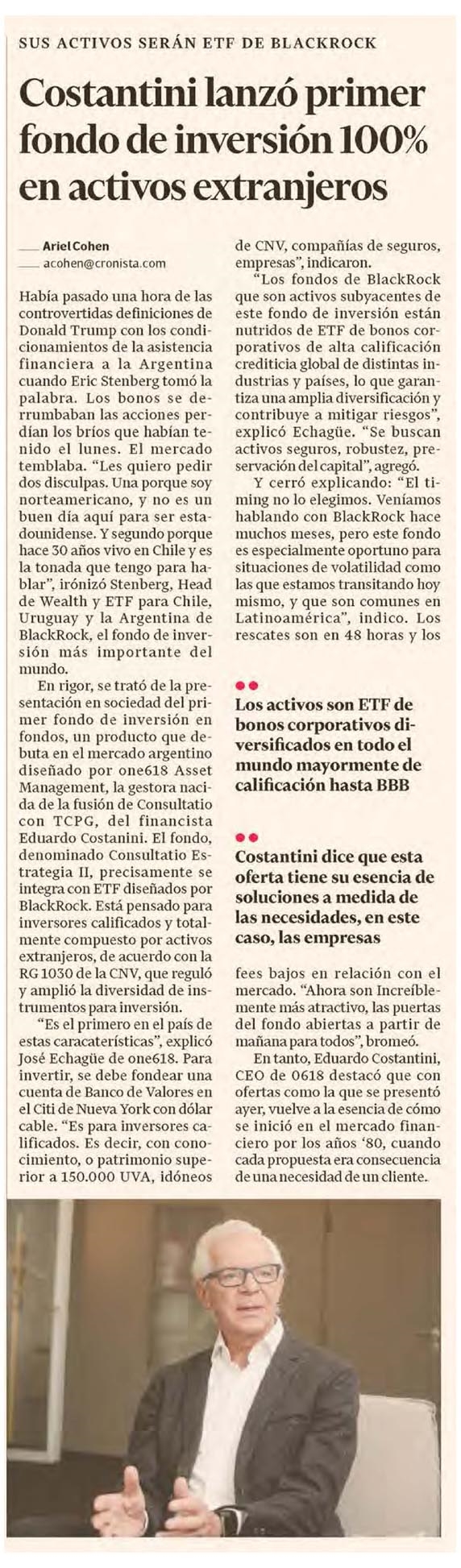 __Ariel Cohen ___acohen@cronista.com Había pasado una hora de las controvertidas definiciones de Donald Trump con los condicionamientos de la asistencia financiera a la Argentina cuando Eric Stenberg tomó la palabra. Los bonos se derrumbaban las acciones perdían los bríos que habían tenido el lunes. El mercado temblaba. "Les quiero pedir dos disculpas. Una porque soy norteamericano, y no es un buen día aquí para ser estadounidense. Y segundo porque hace 30 años vivo en Chile y es la tonada que tengo para hablar", irónizó Stenberg, Head de Wealth y ETF para Chile, Uruguay y la Argentina de BlackRock, el fondo de inversión más importante del mundo. En rigor, se trató de la presentación en sociedad del primer fondo de inversión en fondos, un producto que debuta en el mercado argentino diseñado por one618 Asset Management, la gestora nacida de la fusión de Consultatio con TCPG, del financista Eduardo Costanini. El fondo, denominado Consultatio Estrategia II, precisamente se integra con ETF diseñados por BlackRock. Está pensado para inversores calificados y totalmente compuesto por activos extranjeros, de acuerdo con la RG 1030 de la CNV, que reguló y amplió la diversidad de instrumentos para inversión. "Es el primero en el país de estas caracaterísticas", explicó José Echagüe de one618. Para invertir, se debe fondear una cuenta de Banco de Valores en el Citi de Nueva York con dólar cable. "Es para inversores calificados. Es decir, con conocimiento, o patrimonio superior a 150.000 UVA, idóneos de CNV, compañías de seguros, empresas", indicaron. "Los fondos de BlackRock que son activos subyacentes de este fondo de inversión están nutridos de ETF de bonos corporativos de alta calificación crediticia global de distintas industrias y países, lo que garantiza una amplia diversificación y contribuye a mitigar riesgos", explicó Echagüe. "Se buscan activos seguros, robustez, preservación del capital", agregó. Y cerró explicando: "El timing no lo elegimos. Veníamos hablando con BlackRock hace muchos meses, pero este fondo es especialmente oportuno para situaciones de volatilidad como las que estamos transitando hoy mismo, y que son comunes en Latinoamérica", indico. Los rescates son en 48 horas y los fees bajos en relación con el mercado. "Ahora son Increíblemente más atractivo, las puertas del fondo abiertas a partir de mañana para todos", bromeó. En tanto, Eduardo Costantini, CEO de 0618 destacó que con ofertas como la que se presentó ayer, vuelve a la esencia de cómo se inició en el mercado financiero por los años ‘80, cuando cada propuesta era consecuencia de una necesidad de un cliente.