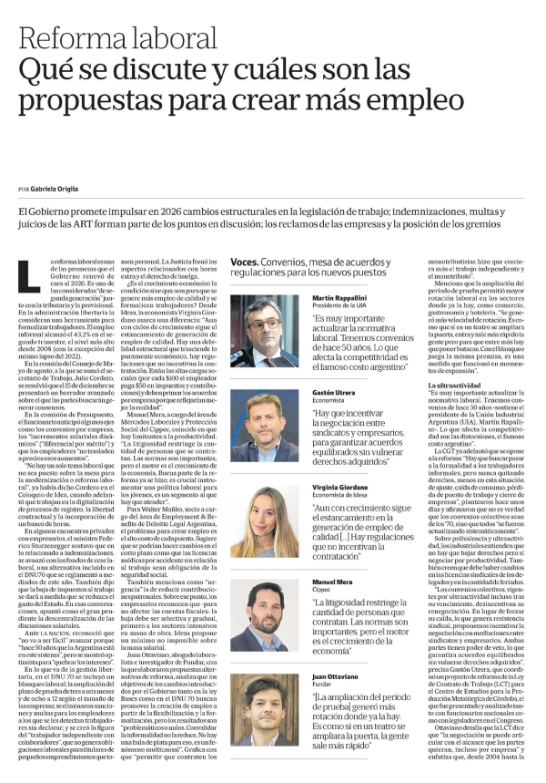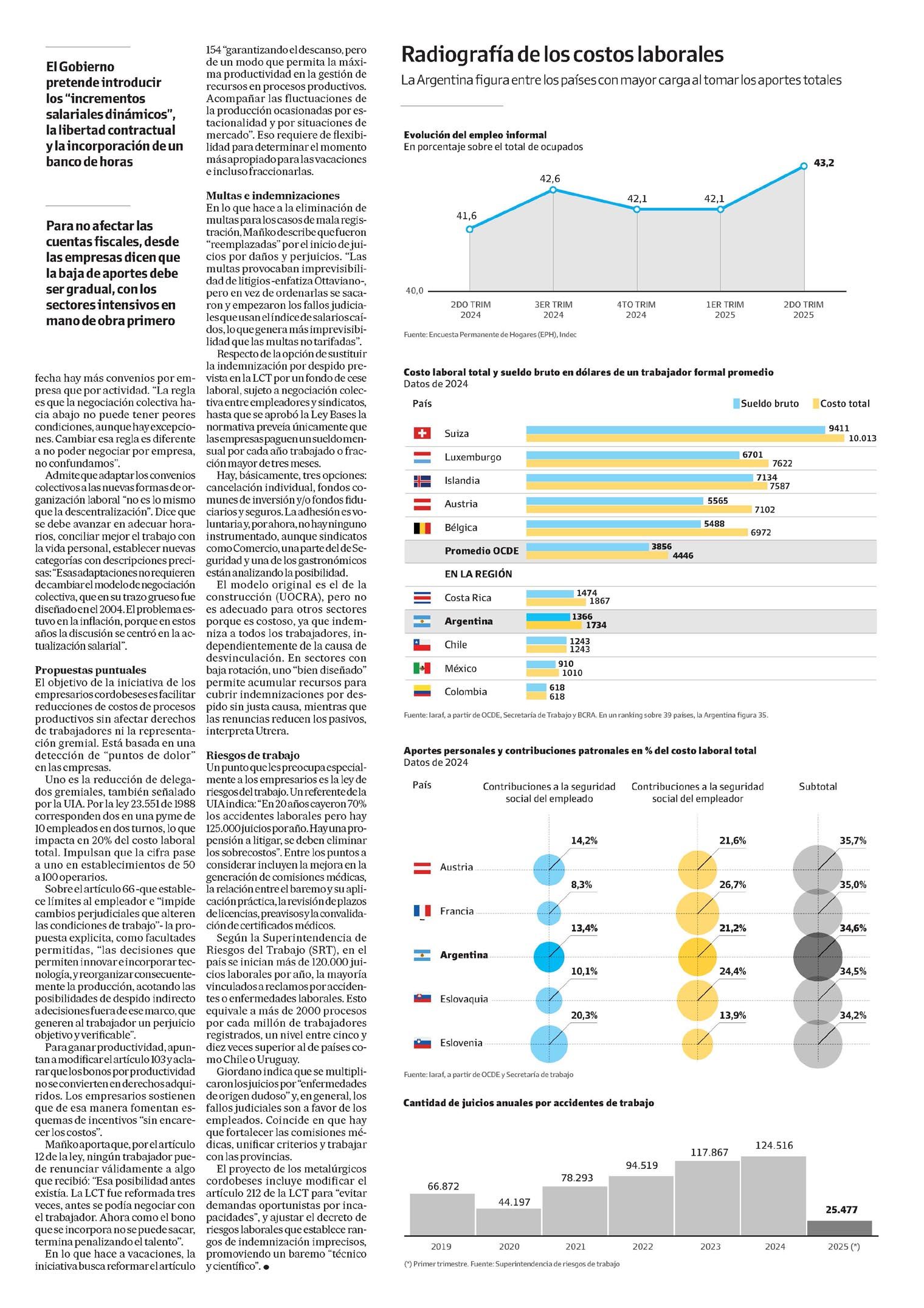 La reforma laboral es una de las promesas que el Gobierno renovó de cara al 2026. Es una de las consideradas "de segunda generación" junto con la tributaria y la previsional. En la administración libertaria la consideran una herramienta para formalizar trabajadores. El empleo informal alcanzó el 43,2% en el segundo trimestre, el nivel más alto desde 2008 (con la excepción del mismo lapso del 2022). En la reunión del Consejo de Mayo de agosto, a la que se sumó el secretario de Trabajo, Julio Cordero, se resolvió que el 15 de diciembre se presentará un borrador avanzado sobre el que las partes buscarán generar consensos. En la comisión de Presupuesto, el funcionario anticipó algunos ejes como los convenios por empresa, los "incrementos salariales dinámicos" ("diferencial por mérito") y que los empleadores "no trasladen a precios esos aumentos". "No hay un solo tema laboral que no sea puesto sobre la mesa para la modernización o reforma laboral", ya había dicho Cordero en el Coloquio de Idea, cuando adelantó que trabajan en la digitalización de procesos de registro, la libertad contractual y la incorporación de un banco de horas. En algunos encuentros privados con empresarios, el ministro Federico Sturzenegger sostuvo que en lo relacionado a indemnizaciones, se avanzó con los fondos de cese laboral, una alternativa incluida en el DNU70 que se reglamentó a mediados de este año. También dijo que la baja de impuestos al trabajo se dará a medida que se reduzca el gasto del Estado. En esas conversaciones, apuntó como el gran pendiente la descentralización de las discusiones salariales. Ante LA NACION, reconoció que "no va a ser fácil" avanzar porque "hace 50 años que la Argentina está en este sistema", pero se mostró optimista para "quebrar los intereses". En lo que va de la gestión libertaria, en el DNU 70 se incluyó un blanqueo laboral; la ampliación del plazo de prueba de tres a seis meses y de ocho a 12 según el tamaño de las empresas; se eliminaron sanciones y multas para los empleadores a los que se les detectan trabajadores sin declarar; y se creó la figura del "trabajador independiente con colaboradores", que no genera obligaciones laborales para titulares de pequeños emprendimientos que tomen personal. La Justicia frenó los aspectos relacionados con horas extra y el derecho de huelga. ¿Es el crecimiento económico la condición sine qua non para que se genere más empleo de calidad y se formalicen trabajadores? Desde Idesa, la economista Virginia Giordano marca una diferencia: "Aun con ciclos de crecimiento sigue el estancamiento de generación de empleo de calidad. Hay una debilidad estructural que trasciende lo puramente económico, hay regulaciones que no incentivan la contratación. Están las altas cargas sociales (por cada $100 el empleador paga $50 en impuestos y contribuciones) y deben primar los acuerdos por empresa porque reflejarían mejor la realidad". Manuel Mera, a cargo del área de Mercados Laborales y Protección Social del Cippec, coincide en que hay limitantes a la productividad. "La litigiosidad restringe la cantidad de personas que se contratan. Las normas son importantes, pero el motor es el crecimiento de la economía. Buena parte de la reforma ya se hizo; es crucial instrumentar una política laboral para los jóvenes, es un segmento al que hay que atender". Para Walter Mañko, socio a cargo del área de Employment & Benefits de Deloitte Legal Argentina, el problema para crear empleo es el alto costo de cada puesto. Sugiere que se podrían hacer cambios en el corto plazo como que las licencias médicas por accidente sin relación al trabajo sean obligación de la seguridad social. También menciona como "urgencia" la de reducir contribuciones patronales. Sobre ese punto, los empresarios reconocen que -para no afectar las cuentas fiscales- la baja debe ser selectiva y gradual, primero a los sectores intensivos en mano de obra. Idesa propone un mínimo no imponible sobre la masa salarial. Juan Ottaviano, abogado labora- lista e investigador de Fundar, con la que elaboraron propuestas alternativas de reforma, analiza que los objetivos de los cambios introducidos por el Gobierno tanto en la ley Bases como en el DNU 70 buscan promover la creación de empleo a partir de la flexibilización y la formalización, pero los resultados son "problemáticos o nulos. Convalidar la informalidad no la reduce. No hay una bala de plata para eso, es un fenómeno multicausal". Grafica con que "permitir que contraten los monotributistas hizo que creciera más el trabajo independiente y el monotributo". Menciona que la ampliación del período de prueba permitió mayor rotación laboral en los sectores donde ya la hay, como comercio, gastronomía y hotelería. "Se generó más velocidad de rotación. Es como que si en un teatro se ampliara la puerta, entra y sale más rápido la gente pero para que entre más hay que poner butacas. Con el blanqueo juega la misma premisa, es una medida que funcionó en momentos de expansión". La ultraactividad "Es muy importante actualizar la normativa laboral. Tenemos convenios de hace 50 años -sostiene el presidente de la Unión Industrial Argentina (UIA), Martín Rapallini-. Lo que afecta la competitividad son las distorsiones, el famoso costo argentino". La CGT ya adelantó que se opone a la reforma: "Hay que buscar pasar a la formalidad a los trabajadores informales, pero nunca quitando derechos, menos en esta situación de ajuste, caída de consumo, pérdida de puesto de trabajo y cierre de empresas", plantearon hace unos días y afirmaron que no es verdad que los convenios colectivos sean de los ‘70, sino que todos "se fueron actualizando sistemáticamente". Sobre polivalencia y ultraactividad, los industriales entienden que no hay que bajar derechos pero sí negociar por productividad. También creen que debe haber cambios en las licencias sindicales de los delegados y en la cantidad de feriados. "Los