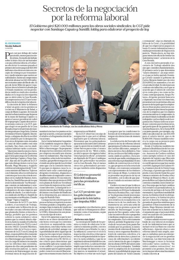 Pasó casi por debajo del radar para todos, menos para los sindicalistas. En medio del debate sobre la letra chica de un borrador con una reforma laboral, el Gobierno efectivizó la semana pasada el primero de los tres pagos de $20.000 millones a las obras sociales en concepto de reintegros por tratamientos y medicamentos que suelen ser subsidiados. Existe un compromiso oficial de abonar los $40.000 millones restantes antes del fin de año. El giro de Javier Milei de querer regularizar ahora la histórica deuda que el Estado mantiene con las prestadoras médicas sindicales siembra dudas en la negociación tripartita que se abrió entre la Casa Rosada, los empresarios y la CGT por la modificación de la legislación laboral. La decisión de abrir la billetera y tener un gesto con los gremios se cocinó en el Ministerio de Salud, a cargo de Mario Lugones. Se trata de uno de los funcionarios que llegaron de la mano de Santiago Caputo y a quien el asesor presidencial rodeó de tropa propia. Caputo descartó esta semana convocar a la CGT, aunque elogió en un pasillo de la Casa Rosada al nuevo triunvirato de mando integrado por Jorge Sola, Cristian Jerónimo y Octavio Argüello. Sin embargo, a ninguno de ellos le escribió para saludarlo por la designación. Con otros dirigentes más avezados el canal de intercambio está más aceitado. Sus chats con los sindicalistas habrían vuelto a activarse. "Queremos interlocutores claros. A [Julio] Cordero no le da. Queremos que el nexo para negociar la reforma sean Santiago Caputo y Diego Santilli", dijo uno de los jefes de la CGT que más diálogo tienen con la Casa Rosada. Hugo Moyano y Argüello celebraron la designación del "Colo" como ministro del Interior. Tejieron con él durante años los millonarios contratos por la recolección de residuos en la ciudad de Buenos Aires. De hecho, Santilli fue uno de los que avaló la denominada "ley Moyano", que consiste en indemnizar y reincorporar de forma inmediata a los trabajadores de una empresa que cambia de dueño. Los interlocutores sindicales de Macri y Santilli de ese momento eran Moyano, Claudio "Chiqui" Tapia y Argüello. El malestar de la CGT con Julio Cordero, el secretario de Trabajo, se acentuó ante la filtración de un borrador con una reforma laboral que planteaba límites al derecho a huelga, prohibir que los gremios cobren la cuota solidaria y otros puntos que la central obrera objetó en la Justicia cuando el Gobierno avanzó con el decreto 70/23 y con el decreto 340/25. Gerardo Martínez, histórico líder de la Uocra y representante de la CGT en el Consejo de Mayo, responsabilizó directamente al ministro de Desregulación, Federico Sturzenegger, por intentar volver a la carga de manera inconsulta con las reformas más resistidas, algunas de ellas aún pendientes de una resolución judicial. La mera presencia de Sturzenegger en una eventual mesa de negociación di- namitaría incluso los puntos en los que hay acuerdo, como por ejemplo el relativo a la fragmentación de las vacaciones. En la Unión Industrial Argentina (UIA) también surgieron objeciones contra "el coloso", como llama Milei a Sturzenegger. Su propuesta de negociar los convenios colectivos por empresa encendió una alarma entre los industriales. Hay muchas compañías, sobre todo las multinacionales, que prefieren negociar con el sindicato principal de la actividad antes que con la comisión interna. Es porque en algunos casos la comisión suele estar controlada por dirigentes trotskistas, dispuestos a desafiar tanto al empleador como a sujefatura sindical. El caso más emblemático fue una protesta en 2009 en la planta de Kraft (ex-Terrabusi) en reclamo de mejoras en las condiciones laborales. La huelga de la comisión interna duró 38 días a pesar del ánimo conciliador del Sindicato de la Alimentación, por entonces a cargo de Rodolfo Daer. La negociación colectiva por empresa se da hoy en la práctica en muchísimas grandes compañías, pero siempre bajo la tutela del sindicato principal de la actividad. El Smata, la UOM y Alimentación son pioneros en este tipo de tratos. En la UIA apuestan a que la normativa no se altere demasiado en este ítem y creen que los convenios colectivos se mantendrán como hasta ahora, con el ida y vuelta con el sindicato de actividad, aunque con la posibilidad de abrir algún tipo de negociación especial por empresa. Se lo llama sistema de prelación y estuvo vigente en los 90. Sirvió como criterio para determinar qué norma debe aplicarse cuando existe un conflicto. Los gremios huelen en este punto que les quieren quitar poder, como lo reconoció Sturzenegger esta semana en una charla con empresarios en Madrid. En la CGT observan con algo de resignación lo que será el debate legislativo por la reforma laboral. Presienten que los gobernadores apoyarán la iniciativa del Gobierno y que la oposición no tendrá la suficiente fuerza para evitar el avance del proyecto de ley. "Mirá a Jaldo, ya salió a apoyar sin siquiera haber visto el proyecto oficial", se lamentó un diputado del PJ por el ambiguo juego del gobernador tucumano con la Casa Rosada. Hay al menos otros tres gobernadores peronistas que también están dispuestos a acompañar a los libertarios, pero que aún no lo blanquearon abiertamente como el tucumano, según averiguó la nación. ¿Reforma más light? La estrategia de fondo de los gremios es tratar de edulcorar la iniciativa lo máximo posible, con tres prioridades para blindar la caja y su influencia: conservar el rol en la negociación colectiva; evitar que se revise la obligatoriedad de los aportes y la cuota solidaria, y que no se suprima la ultraactividad de los convenios colectivos. La ultraactividad implica que todos los convenios tienen un tiempo de duración y si no hay nuevos, se mantiene el actual. Su objetivo es evitar un vacío legal y asegurar que las condiciones laborales de los trabajadores se mantengan sin alteraciones de manera unilateral. La el
