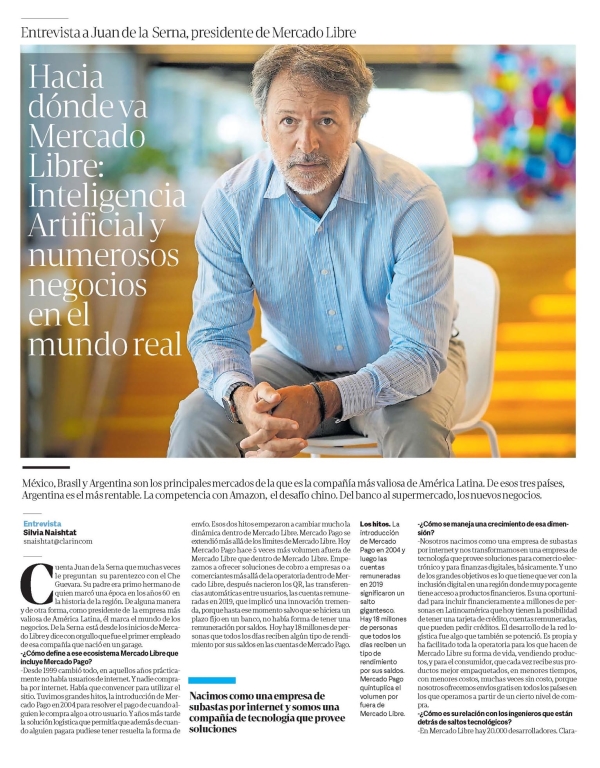 Cuenta Juan de la Serna que muchas veces le preguntan su parentezco con el Che Guevara. Su padre era primo hermano de quien marcó una época en los años 60 en la historia de la región. De alguna manera y de otra forma, como presidente de la empresa más valiosa de América Latina, él marca el mundo de los negocios. De la Serna está desde los inicios de Mercado Libre y dice con orgullo que fue el primer empleado de esa compañía que nació en un garage. -¿Cómo define a ese ecosistema Mercado Libre que incluye Mercado Pago? -Desde 1999 cambió todo, en aquellos años prácticamente no había usuarios de internet. Y nadie compraba por internet. Había que convencer para utilizar el sitio. Tuvimos grandes hitos, la introducción de Mercado Pago en 2004 para resolver el pago de cuando alguien le compra algo a otro usuario. Y años más tarde la solución logística que permitía que además de cuando alguien pagara pudiese tener resuelta la forma de Entrevista a Juan de la Serna, presidente de Mercado Libre envío. Esos dos hitos empezaron a cambiar mucho la dinámica dentro de Mercado Libre. Mercado Pago se extendió más allá de los límites de Mercado Libre. Hoy Mercado Pago hace 5 veces más volumen afuera de Mercado Libre que dentro de Mercado Libre. Empezamos a ofrecer soluciones de cobro a empresas o a comerciantes más allá de la operatoria dentro de Mercado Libre, después nacieron los QR, las transferencias automáticas entre usuarios, las cuentas remuneradas en 2019, que implicó una innovación tremenda, porque hasta ese momento salvo que se hiciera un plazo fijo en un banco, no había forma de tener una remuneración por saldos. Hoy hay 18 millones de personas que todos los días reciben algún tipo de rendimiento por sus saldos en las cuentas de Mercado Pago. -¿Cómo se maneja una crecimiento de esa dimensión? -Nosotros nacimos como una empresa de subastas por internet y nos transformamos en una empresa de tecnología que provee soluciones para comercio electrónico y para finanzas digitales, básicamente. Y uno de los grandes objetivos es lo que tiene que ver con la inclusión digital en una región donde muy poca gente tiene acceso a productos financieros. Es una oportunidad para incluir financieramente a millones de personas en Latinoamérica que hoy tienen la posibilidad de tener una tarjeta de crédito, cuentas remuneradas, que pueden pedir créditos. El desarrollo de la red logística fue algo que también se potenció. Es propia y ha facilitado toda la operatoria para los que hacen de Mercado Libre su forma de vida, vendiendo productos, y para el consumidor, que cada vez recibe sus productos mejor empaquetados, en menores tiempos, con menores costos, muchas veces sin costo, porque nosotros ofrecemos envíos gratis en todos los países en los que operamos a partir de un cierto nivel de compra. -¿Cómo es su relación con los ingenieros que están detrás de saltos tecnológicos? -En Mercado Libre hay 20.000 desarrolladores. Clara mente el corazón de todo lo que hacemos es el equipo de tecnología. -¿Cuál es el rol de la Inteligencia Artificial? -Está generando una revolución impresionante. Y atraviesa todas las áreas del Mercado Libre. Estamos enfocados en que todas las áreas encuentren, a través de la IA, soluciones que puedan hacer su vida más fácil,, más productiva, más eficiente, mejor en términos de costos, y eso lo venimos haciendo hace años. Empezamos con los que se llamaban los modelos de Machine Learning. En Mercado Libre se tiene la oportunidad de hacer preguntas a alguien que está vendiendo productos. A partir de eso, nuestros modelos empiezan a aprender cuáles son las preguntas y cuáles son las respuestas, y empiezan a contestar directamente por cuenta y orden de nuestros vendedores. El comprador recibe una respuesta como si se lo hubiese dado un vendedor, en cuestión de segundos, mejora la compra. En el departamento de legales, por ejemplo, clasifican lo que llega y va reasignando. Es como una mesa de entradas y hay negociadores online que resuelven problemas de reclamo, que lo hace mucho más rápido, y mucho más barato, y más eficientemente, y genera lo que nosotros llamamos un NPS, que es un índice de medición de satisfacción. En el caso del equipo de tecnología, cada vez más las líneas de código, las desarrollan soluciones de inteligencia artificial. Lo que hay que aprender es saber pedirle a la inteligencia artificial qué es lo que uno quiere, lo que se llama prompt, es casi como un nuevo trabajo, hacer de prompt, y eso hace que, en lugar de estar horas escribiendo asterisco, jeroglífico, signo pesos y no sé qué cosa, ahora uno sencillamente le dice a alguna de las soluciones que hay en inteligencia artificial que le genere el código para lo que está buscando hacer. Y eso está evolucionando de una manera tal que hay soluciones que hace 90 días parecían que eran la última Coca-Cola del desierto, que hoy tal vez no existen más. Y surgen nuevas que van mejorando, todos los modelos y toda la eficiencia y productividad que eso genera. Estamos enfocando mucho en que la mayor parte de los equipos piensen, hemos creado equipos para darle soluciones a los equipos que no son de tecnología para ir generando mayores eficiencias y mejores servicios. Es fabuloso, con la velocidad con la que está ocurriendo, no me acuerdo algo tan revolucionario. -¿Cómo les está yendo en América Latina? -Brasil, México y Argentina ese es el orden en términos de volumen de negocio, no así de rentabilidad. Brasil es el país con mayor competencia en el mundo. Allí competimos con Amazon desde 2014, hoy ellos son el cuarto, hay algunos players locales y después compañías asiáticas que están invirtiendo muy fuerte desde hace un tiempo. En México pasa algo parecido, competimos con Amazon desde el 2017 y ahí no hay tantos players locales. Sí hay más competencia en términos de la parte financiera, pero son dos mercados incre