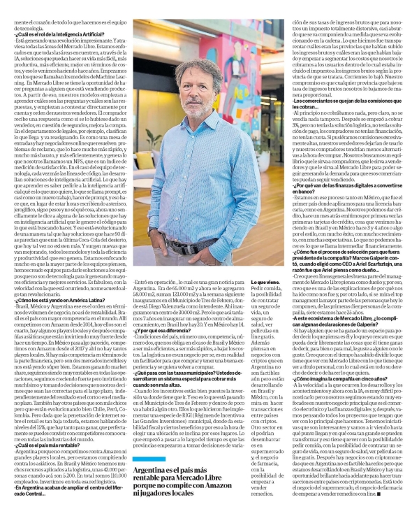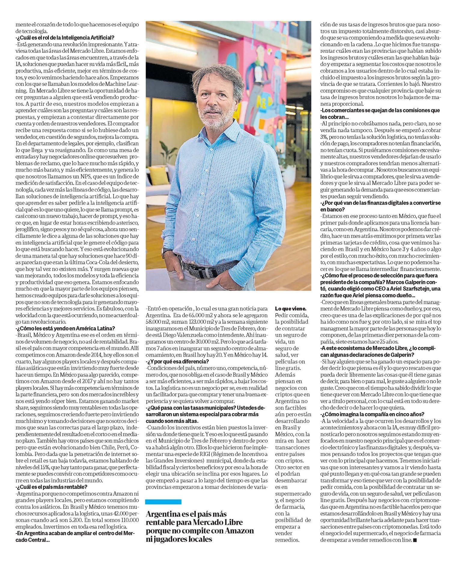 -Entró en operación , lo cual es una gran noticia para Argentina. Era de 65.000 m2 y ahora se le agregaron 58.000 m2, suman 123.000 m2 y a la semana siguiente inauguramos en el Municipio de Tres de Febrero, donde está Diego Valenzuela como intendente. Ahi inauguramos un centro de 30.000 m2. Pero lo que acá tardamos 7 años en inaugurar un segundo centro de almacenamiento, en Brasil hoy hay 20. Y en México hay 14. -¿Y por qué esa diferencia? -Condiciones del país, número uno, competencia, número dos, que nos obliga en el caso de Brasil y México a ser más eficientes, a ser más rápidos, a bajar los costos. La logística no es un negocio per se, es en realidad un facilitador para que comprar y tener una buena experiencia y se quiera volver a comprar. -¿Qué pasa con las tasas municipales? Ustedes desarrollaron un sistema especial para cobrar más cuando son más altas. -Cuando los incentivos están bien puestos la inversión va donde tiene que ir. Y eso es lo que está pasando en el Municipio de Tres de Febrero y dentro de poco va a habrá algún otro. Ellos lo que hicieron fue implementar una especie de RIGI (Régimen de Incentivo a las Grandes Inversiones) municipal, donde da estabilidad fiscal y ciertos beneficios y por eso a la hora de elegir una ubicación se inclina por esos lugares. Lo que empezó a pasar a lo largo del tiempo es que las provincias empezaron a tomar decisiones de varia ción de sus tasas de ingresos brutos que para nosotros un impuesto totalmente distorsivo, casi absurdo que se va componiendo a medida que se va evolucionando en la cadena .Lo que hicimos fue transparentar cuáles eran las provincias que habían subido los ingresos brutos y cuáles eran las que habían bajado y empezar a segmentar los costos que nosotros le cobramos a los usuarios dentro de lo cual estaba incluido el impuesto a los ingresos brutos según la provincia de que se tratara. Corrientes lo bajó. Nuestro compromiso es que cualquier provincia que baje su tasa de ingresos brutos nosotros lo bajamos de manera proporcional. -Los comerciantes se quejan de las comisiones que les cobran... -Al principio no cobrábamos nada, pero claro, no se vendía nada tampoco. Después se empezó a cobrar 3%, pero no tenías la solución logística, no tenías solución de pago, los compradores no tenían financiación, no tenían cuota. Si pusiéramos comisiones excesivamente altas, nuestros vendedores dejarían de usarlo y nuestros compradores tendrían menos alternativas a la hora de comprar . Nosotros buscamos un equilibrio que le sirva a compradores, que le sirva a vendedores y que le sirva al Mercado Libre para poder seguir generando la demanda para que esos comerciantes puedan seguir vendiendo. -¿Por qué van de las finanzas digitales a convertirse en banco? -Estamos en ese proceso tanto en México, que fue el primer país donde aplicamos para una licencia bancaria, como en Argentina. Nosotros podemos dar crédito, hace un mes atrás emitimos por primera vez las primeras tarjetas de crédito, cosa que venimos haciendo en Brasil y en México hace 3 y 4 años o algo por el estilo, con mucho éxito, con mucho crecimiento, con muchas expectativas. Lo que no podemos hacer es lo que se llama intermediar financieramente. -¿Cómo fue el proceso de selección para que fuera presidente de la compañía? Marcos Galperin contó, cuando eligió como CEO a Ariel Szarfsztejn, una razón fue que Ariel piensa como dueño... -Creo que en líneas generales buena parte del managment de Mercado Libre piensa como dueño y, por eso, creo que es una de las explicaciones de por qué nos ha ido como nos fue y, por otro lado, si se mira el top managment la mayor parte de las personas que hoy lo componen, de las primeras diez personas de la compañía, siete estamos hace 25 años. -A este ecosistema de Mercado Libre, ¿ lo complican algunas declaraciones de Galperin? -Si hay alguien que se ha ganado un espacio para poder decir lo que piensa es él y lo que yo rescato es que pueda decir libremente las cosas que él tiene ganas de decir, para bien o para mal, le guste a alguien o no le guste. Creo que con el tiempo ha sabido dividir lo que tiene que ver con Mercado Libre con lo que tiene que ver a título personal, con lo cual está en todo su derecho de decir o de hacer lo que quiera. -¿Cómo imagina la compañía en cinco años? -A la velocidad a la que ocurren los desarrollos y los acontecimientos y ahora con la IA, es muy difícil pronosticarlo pero nosotros seguimos estando muy enfocados en nuestro negocio principal que es el comercio electrónico y las finanzas digitales y, después, vamos pensando todos los proyectos que tengan que ver con lo principal que hacemos. Tenemos iniciativas que son interesantes y vamos a ir viendo hasta qué punto llegan y en qué cosa tan grande se pueden transformar y eso tiene que ver con la posibilidad de pedir comida, con la posibilidad de contratar un seguro de vida, con un seguro de salud, ver películas on line gratis. Después hay negocios con criptomonedas que en Argentina no es factible hacerlos pero que estamos desarrollándolo en Brasil y México y hay una oportunidad brillante hacia adelante para hacer transacciones entre países con criptomonedas. Está todo el negocio del supermercado, el negocio de farmacia de empezar a vender remedios con line.