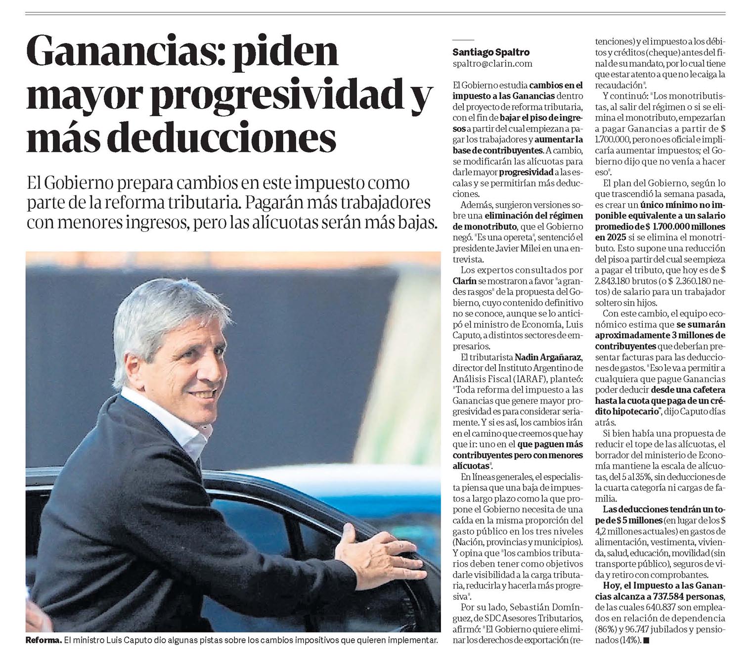 El Gobierno prepara cambios en este impuesto como parte de la reforma tributaria. Pagarán más trabajadores con menores ingresos, pero las alícuotas serán más bajas. Reforma. El ministro Luis Caputo dio algunas pistas sobre los cambios impositivos que quieren implementar. Santiago Spal-paltro@clarin.com El Gobierno estudia cambios en el impuesto a las Ganancias dentro del proyecto de reforma tributaria, con el fin de bajar el piso de ingresos a partir del cual empiezan a pagar los trabajadores y aumentar la base de contribuyentes. A cambio, se modificarán las alícuotas para dar mayor progresividad a las escalas y se permitirían más deducciones. Además, surgieron versiones sobre una eliminación del régimen de monotributo, que el Gobierno negó. "Es una opereta", sentenció el presidente Javier Milei en una entrevista. Los expertos consultados por Clarín se mostraron a favor "grandes rasgos" de la propuesta del Gobierno, cuyo contenido definitivo no se conoce, aunque se lo anticipó el ministro de Economía, Luis Caputo, a distintos sectores de empresarios. El tributarista Nadin Argañaraz, director del Instituto Argentino de Análisis Fiscal (IARAP), planteó: "Toda reforma del impuesto a las Ganancias que genere mayor progresividad es para considerar seriamente. Y si es así, los cambios irán en el camino que creemos que hay que ir: uno en el que paguen más contribuyentes pero con menores alícuotas". En líneas generales, el especialista piensa que una baja de impuestos a largo plazo como la que propone el Gobierno necesita de una caída en la misma proporción de gasto público en los tres niveles (Nación, provincias y municipios). Y opina que "los cambios tributarios deben tener como objetivos darle visibilidad a la carga tributaria, reducirla y hacerla más progresiva". Por su lado, Sebastián Domínguez, de SDC Asesores Tributarios, afirmó: "El Gobierno quiere eliminar los derechos de exportación (retenciones) y el impuesto a los débitos y créditos (cheque) antes del final de su mandato, por lo cual tiene que estar atento a que no le caiga la recaudación". Y continuó: "Los monotributistas, al salir del régimen o si se elimina el monotributo, empezarían a pagar Ganancias a partir de $ 1.700.000, pero no es oficial e implicaría aumentar impuestos; el Gobierno dijo que no venía a hacer eso". El plan del Gobierno, según lo que trascendió la semana pasada, es crear un único mínimo no imponible equivalente a un salario promedio de $ 1.700.000 millones en 2025 si se elimina el monotributo. Esto supone una reducción del piso a partir del cual se empieza a pagar el tributo, que hoy es de $ 2.843.180 brutos (o $ 2.360.180 netos) de salario para un trabajador soltero sin hijos. Con este cambio, el equipo económico estima que se sumarán aproximadamente 3 millones de contribuyentes que deberían presentar facturas para las deducciones de gastos. "Eso le va a permitir a cualquiera que pague Ganancias poder deducir desde una cafetería hasta la cuota que paga de un crédito hipotecario", dijo Caputo días atrás. Si bien había una propuesta de reducir el tope de las alícuotas, el borrador del ministerio de Economía mantiene la escala de alícuotas, del 5 al 35%, sin deducciones de la cuarta categoría ni cargas de familia. Las deducciones tendrán un tope de $ 5 millones (en lugar de los $ 4,2 millones actuales) en gastos de alimentación, vestimenta, vivienda, salud, educación, movilidad (si transporte público), seguros de vida y retiro con comprobantes. Hoy, el Impuesto a las Ganancias alcanza a 737.584 personas, de las cuales 640.837 son empleados en relación de dependencia (86%) y 96.747 jubilados y pensionados (14%).