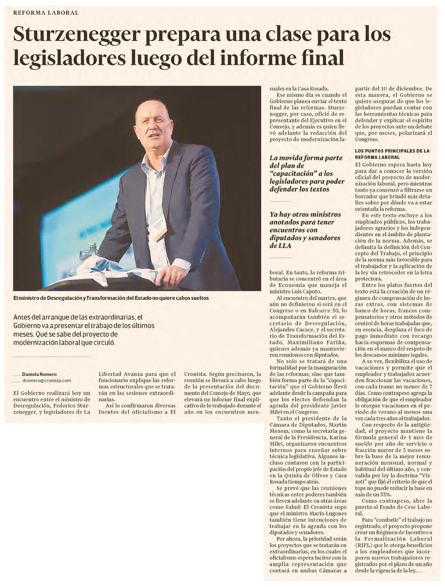 El Gobierno realizará hoy un encuentro entre el ministro de Desregulación, Federico Sturzenegger, y legisladores de La Libertad Avanza para que el funcionario explique las reformas estructurales que se tratarán en las sesiones extraordinarias. Así lo confirmaron diversas fuentes del oficialismo a El Cronista. Según precisaron, la reunión se llevará a cabo luego de la presentación del documento del Consejo de Mayo, que elevará un informe final explicativo de lo trabajado durante el año en los encuentros mensuales en la Casa Rosada. Ese mismo día es cuando el Gobierno planea enviar el texto final de las reformas. Sturzenegger, por caso, ofició de representante del Ejecutivo en el Consejo, y además es quien llevó adelante la redacción del proyecto de modernización la boral. En tanto, la reforma tributaria se concentró en el área de Economía que maneja el ministro Luis Caputo. Al encuentro del martes, que aún no definieron si será en el Congreso o en Balcarce 50, lo acompañarán también el secretario de Desregulación, Alejandro Cacace, y el secretario de Transformación del Estado, Maximiliano Fariña, quienes además ya mantuvieron reuniones con diputados. No solo se tratará de una formalidad por la inauguración de las reformas, sino que también forma parte de la "capacitación" que el Gobierno llevó adelante desde la campaña para que los electos defiendan la agenda del presidente Javier Milei en el Congreso. Tanto el presidente de la Cámara de Diputados, Martín Menem, como la secretaria general de la Presidencia, Karina Milei, organizaron encuentros internos para enseñar sobre técnica legislativa. Algunos incluso contaron con la participación del propio jefe de Estado en la Quinta de Olivos y Casa Rosada tiempo atrás. Se prevé que las reuniones técnicas entre poderes también se lleven adelante en otras áreas como Salud: El Cronista supo que el ministro Mario Lugones también tiene intenciones de trabajar en la agenda con los diputados y senadores. Por ahora, la prioridad serán los proyectos que se tratarán en extraordinarias, en los cuales el oficialismo espera lucirse con la amplia representación que contará en ambas Cámaras a partir del 10 de diciembre. De esta manera, el Gobierno se quiere asegurar de que los legisladores puedan contar con las herramientas técnicas para defender y explicar el espíritu de los proyectos ante un debate que, por meses, polarizará el Congreso. LOS PUNTOS PRINCIPALES DE LA REFORMA LABORAL El Gobierno espera hasta hoy para dar a conocer la versión oficial del proyecto de modernización laboral, pero mientras tanto ya comenzó a filtrarse un borrador que brindó más detalles sobre por dónde va a estar orientada la reforma. En este texto excluye a los empleados públicos, los trabajadores agrarios y los independientes en el ámbito de plantación de la norma. Además, se delimita la definición del Concepto del Trabajo, el principio de la norma más favorable para el trabajador y la aplicación de la ley sin retroceder en la letra protectora. Entre los platos fuertes del texto está la creación de un régimen de compensación de horas extras, con sistemas de banco de horas, francos compensatorios y otros métodos de control de horas trabajadas que, en esencia, desplaza el foco de pago inmediato con recargo hacia esquemas de compensación en el marco del respeto de los descansos mínimos legales. A su vez, flexibiliza el uso de vacaciones y permite que el empleador y trabajador acuerden fraccionar las vacaciones, con cada tramo no menor de 7 días. Como contrapeso agrega la obligación de que el empleador le otorgue vacaciones en el período de verano al menos una vez cada tres años al trabajador. Con respecto de la antigüedad, el proyecto mantiene la fórmula general de 1 mes de sueldo por año de servicio o fracción mayor de 3 meses sobre la base de la mejor remuneración mensual, normal y habitual del último año, y convalida por ley la doctrina "Viz- zoti" que fijó el criterio de que el tope no puede reducir la base en más de un 33%. Como contrapeso, abre la puerta al Fondo de Cese Laboral. Para "combatir" el trabajo no registrado, el proyecto propone crear un Régimen de Incentivo a la Formalización Laboral (RIFL) que le otorga beneficios a los empleadores que incorporen nuevos trabajadores registrados por el plazo de un año desde la vigencia de la ley