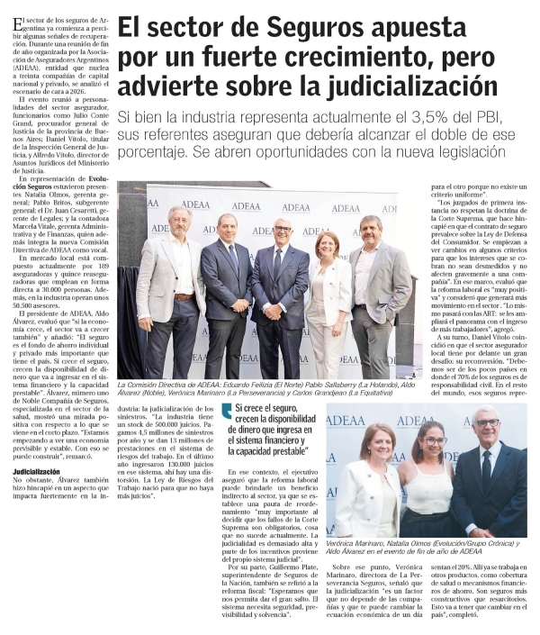 El sector de los seguros de Argentina ya comienza a percibir algunas señales de recuperación. Durante una reunión de fin de año organizada por la Asociación de Aseguradores Argentinos (ADEAA), entidad que nuclea a treinta compañías de capital nacional y privado, se analizó el escenario de cara a 2026. El evento reunió a personalidades del sector asegurador, funcionarios como Julio Conte Grand, procurador general de Justicia de la provincia de Buenos Aires; Daniel Vítolo, titular de la Inspección General de Justicia, y Alfredo Vítolo, director de Asuntos Jurídicos del Ministerio de Justicia. En representación de Evolución Seguros estuvieron presentes Natalia Olmos, gerenta general; Pablo Britos, subgerente general; el Dr. Juan Cesaretti, gerente de Legales; y la contadora Marcela Vitale, gerenta Administrativa y de Finanzas, quien además integra la nueva Comisión Directiva de ADEAA como vocal. En mercado local está compuesto actualmente por 189 aseguradoras y quince reaseguradoras que emplean en forma directa a 30.000 personas. Además, en la industria operan unos 50.500 asesores. El presidente de ADEAA, Aldo Álvarez, evaluó que “si la economía crece, el sector va a crecer también” y añadió: “El seguro es el fondo de ahorro individual y privado más importante que tiene el país. Si crece el seguro, crecen la disponibilidad de dinero que va a ingresar en el sistema financiero y la capacidad prestable”. Álvarez, número uno de Noble Compañía de Seguros, especializada en el sector de la salud, mostró una mirada positiva con respecto a lo que se viene en el corto plazo. “Estamos empezando a ver una economía previsible y estable. Con eso se puede construir”, remarcó. Judicialización No obstante, Álvarez también hizo hincapié en un aspecto que impacta fuertemente en la industria: la judicialización de los siniestros. “La industria tiene un stock de 500.000 juicios. Pagamos 4,5 millones de siniestros por año y se dan 13 millones de prestaciones en el sistema de riesgos del trabajo. En el último año ingresaron 130.000 juicios en ese sistema, ahí hay una distorsión. La Ley de Riesgos del Trabajo nació para que no haya más juicios”. Si bien la industria representa actualmente el 3,5% del PBI, sus referentes aseguran que debería alcanzar el doble de ese porcentaje. Se abren oportunidades con la nueva legislación. Para el otro porque no existe un criterio uniforme”. “Los juzgados de primera instancia no respetan la doctrina de la Corte Suprema, que hace hincapié en que el contrato de seguro prevalece sobre la Ley de Defensa del Consumidor. Se empiezan a ver cambios en algunos criterios para que los intereses que se cobran no sean desmedidos y no afecten gravemente a una compañía”. En ese marco, evaluó que la reforma laboral es “muy positiva” y consideró que generará más movimiento en el sector. “Lo mismo pasará con las ART: se les ampliará el panorama con el ingreso de más trabajadores”, agregó. A su turno, Daniel Vítolo coincidió en que el sector asegurado local tiene por delante un gran desafío; su reconversión. “Debemos ser de los pocos países en donde el 70% de los seguros es de responsabilidad civil. En el resto del mundo, esos seguros representan el 20%. Allí ya se trabaja en otros productos, como cobertura de salud o mecanismos financieros de ahorro. Son seguros más constructivos que resarcitorios. Esto va a tener que cambiar en el país”, completó. Si crece el seguro, crecen la disponibilidad de dinero que ingresa en el sistema financiero y la capacidad prestable En ese contexto, el ejecutivo aseguró que la reforma laboral puede brindarle un beneficio indirecto al sector, ya que se establece una pauta de reordenamiento “muy importante a decidir que los fallos de la Corte Suprema son obligatorios, cosa que no sucede actualmente. La judicialidad es demasiado alta y parte de los incentivos provienen del propio sistema judicial”. Por su parte, Guillermo Plate, superintendente de Seguros de la Nación, también se refirió a la reforma fiscal: “Esperamos que nos permita dar el gran salto. El sistema necesita seguridad, previsibilidad y solvencia”. La Comisión Directiva de ADEAA: Eduardo Feilizia (El Norte) Pablo Sallaberry (La Holando), Aldo Álvarez (Noble), Verónica Marinaro (La Perseverancia) y Carlos Grandjean (La Fquitativa). Verónica Marinaro, Natalia Olmos (Evolución/Grupo Crónica) y Aldo Álvarez en el evento de fin de año de ADEAA. Sobre ese punto, Verónica Marinaro, directora de La Perseverancia Seguros, señaló que la judicialización “es un factor que no depende de las compañías y que te puede cambiar la ecuación económica de un día.